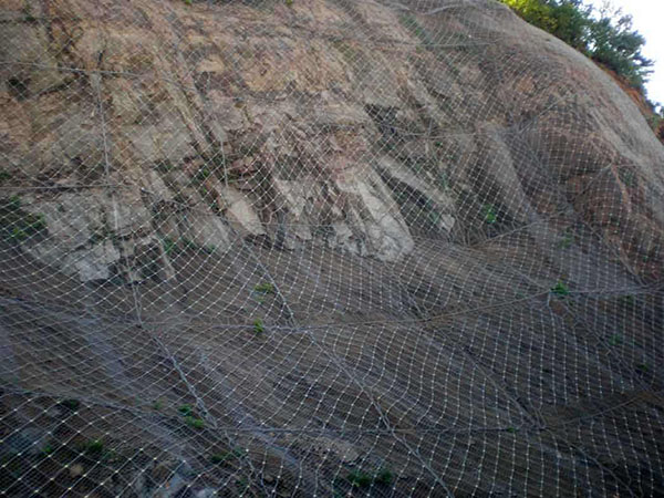 邊坡防護網(wǎng)有主動防護與被動防護,主動防護系統(tǒng)是以鋼絲繩網(wǎng)為主的各類柔性網(wǎng)覆蓋包裹在所需防護斜坡或巖石上,以限制坡面巖石土體的風(fēng)化剝落或破壞以及為巖崩塌(加固作用),或?qū)⒙涫刂朴谝欢ǚ秶鷥?nèi)運動(圍護作用)。被動防護是由鋼絲繩網(wǎng)、環(huán)形網(wǎng)、(需攔截小塊落石時附加一層鐵絲格柵)、固定系統(tǒng)(錨桿、拉錨繩、基座和支撐繩)減壓環(huán)和鋼柱四個主要部分構(gòu)成。鋼柱和鋼絲繩網(wǎng)連接組合構(gòu)成一個整體,對所防護的區(qū)域形成面防護,從而阻止崩塌巖石土體的下墜,起到邊坡防護作用。