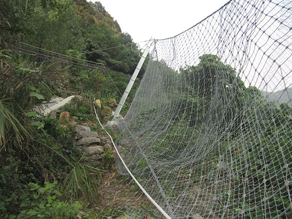 被動邊坡防護網由鋼絲繩網或環形網(需攔截小塊落石時附加一層鐵絲格柵),固定系統(錨桿、攔錨繩、基座和支撐繩)、減壓環和鋼柱四個主要部分構成。鋼柱和鋼絲繩網連接組合構成一個整體,對所防護的區域形成面防護,從而阻止崩塌巖石土體的下墜,起到邊坡防護作用。